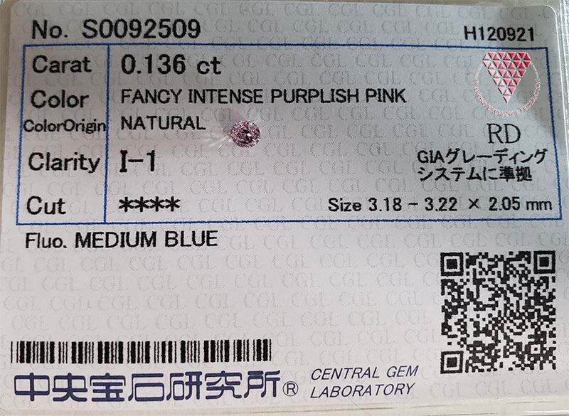 0.136 ct Fancy Intense Purplish Pink I1 天然 ピンク ダイヤモンド ラウンド ルース